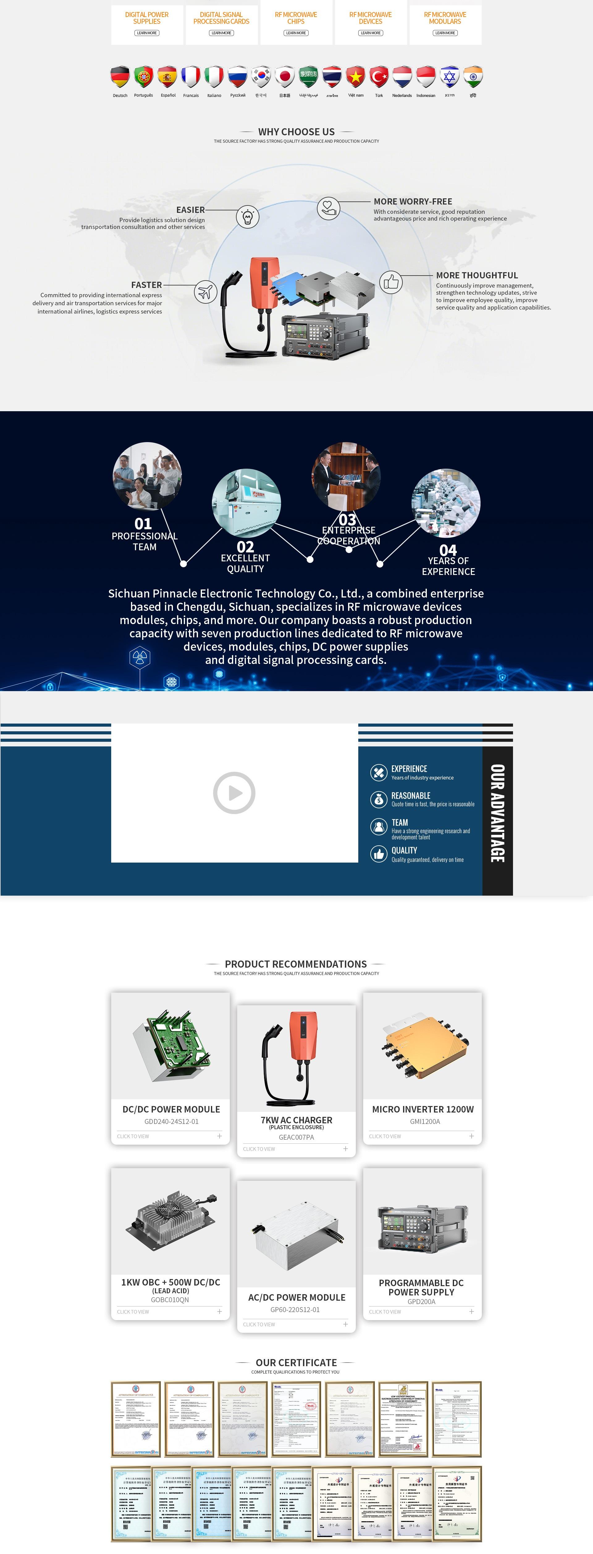 Productos principales:Dispositivos de microondas RF, módulos de microondas RF, chips de microondas RF, fuentes de alimentación de CC, tarjetas de procesamiento de señal digital